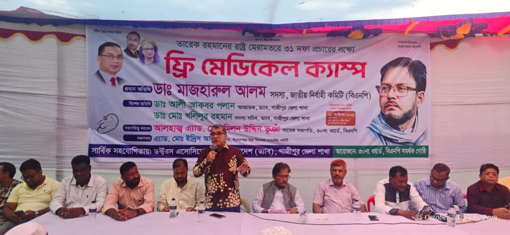 প্রধান অতিথির বক্তব্যে ডাঃ মাজহার বলেন, “আমাদের প্রিয় নেতা তারেক রহমানের রাষ্ট্রকাঠামো মেরামতের ৩১ দফার অন্যতম মূল লক্ষ্য হলো—জনগণের দোরগোড়ায় স্বাস্থ্যসেবা পৌঁছে দেওয়া। আজকের এই ফ্রি মেডিকেল ক্যাম্প সেই লক্ষ্য বাস্তবায়নেরই একটি ক্ষুদ্র প্রয়াস।
