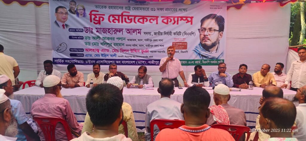 বিশেষ অতিথি তার বক্তব্যে বলেন – আমরা চাই প্রতিটি মানুষ তার স্বাস্থ্য সম্পর্কে সচেতন হোক এবং সহজলভ্য সেবার সুযোগ পোক। তারেক রহমানের ৩১ দফার মূল লক্ষ্যগুলোর মধ্যে স্বাস্থ্যসেবাকে জনগণের দোরগোড়ায় পৌঁছে দেওয়া অত্যন্ত গুরুত্বপূর্ণ। আমি বিশ্বাস করি, এই ধরনের উদ্যোগ গাজীপুরসহ সারাদেশে মানুষের কাছে সঠিক স্বাস্থ্যসেবা পৌঁছানোর ক্ষেত্রে পথপ্রদর্শক হবে।